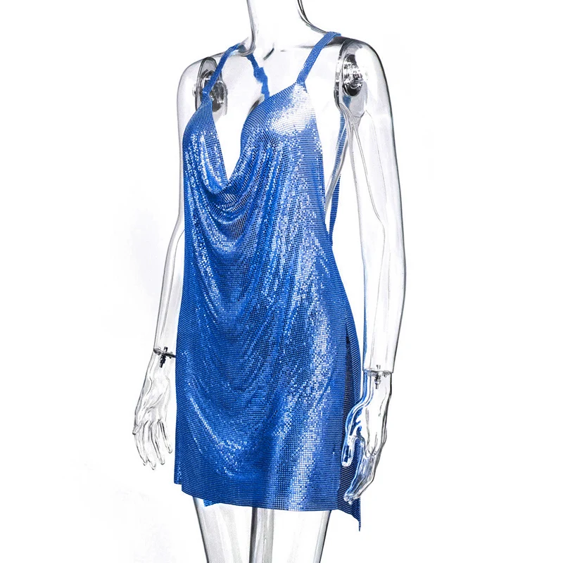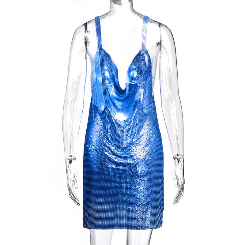 Blue Sexy Metal Crystal Dress Summer V-Neck Hollow Backless Tank Top Women Rhinestone Birthday Party Mini Sling