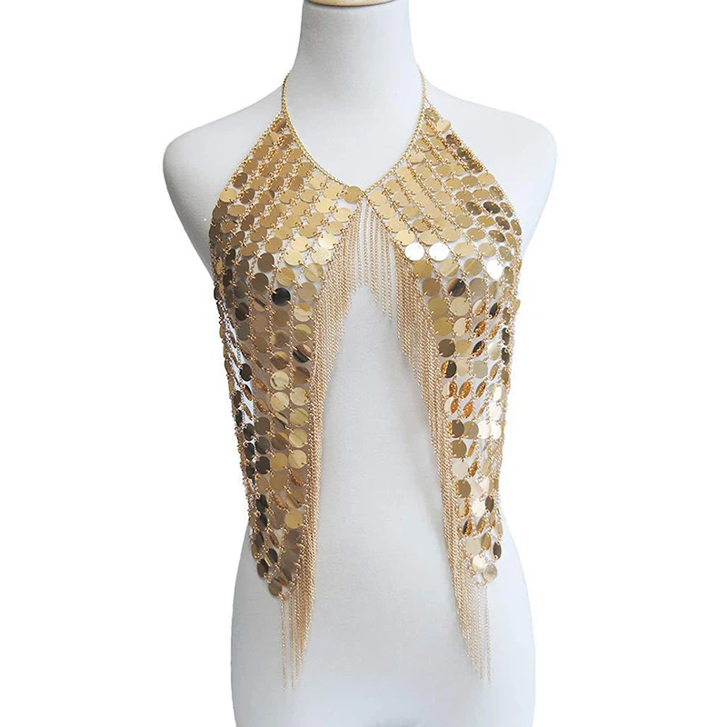 ❤SHINE BRIGHT: This plastic sequin and metal chain crop top will shine brightly under the lamplight. It is easily make you outstanding & eye-catching and more confident and charming.