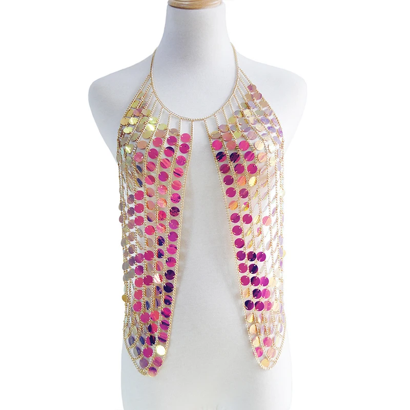 Rose red Shiny Corset Top Women 2023 y2k Festival Bright Sequins Metal Chain Tassel Female Sexy See Through Backless Woman Crop Tank Tops