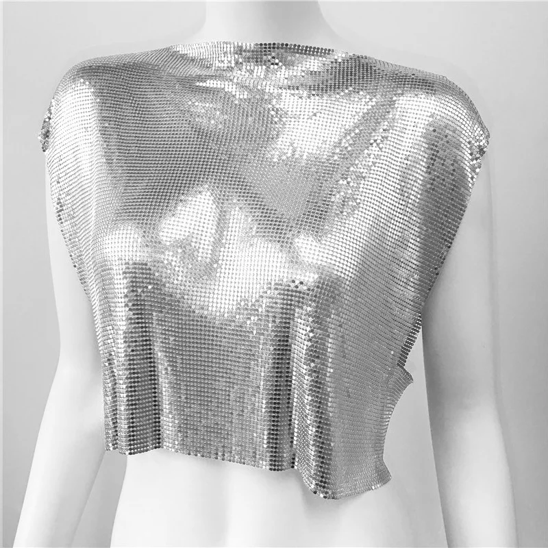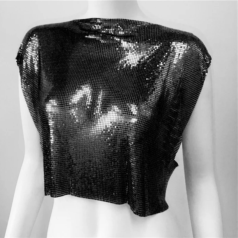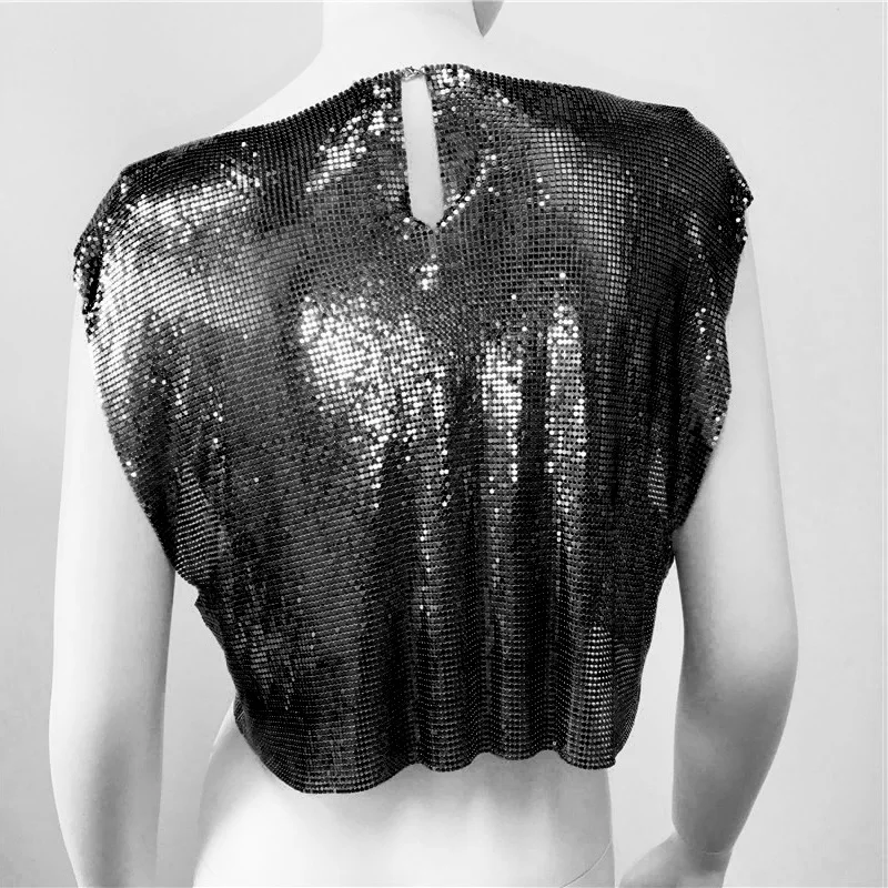 Black Y2k Shiny Metallic Sequins Festival T- Shirts Crop Tops Sexy Women Sleeveless See Through Glitter Sequin Club Party Rave T Shirt