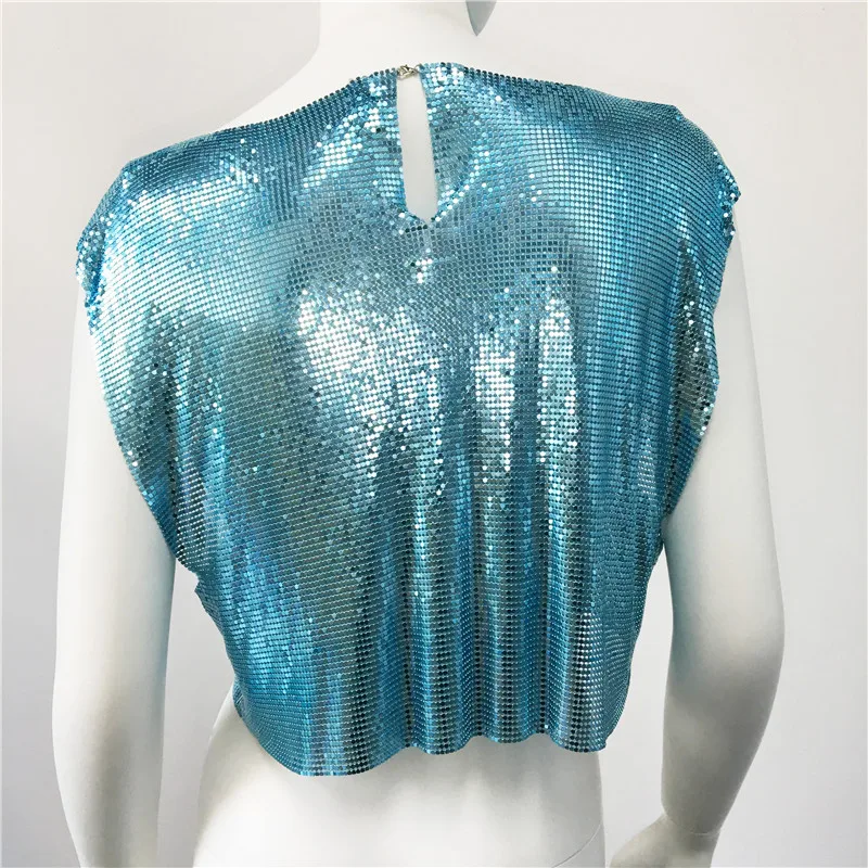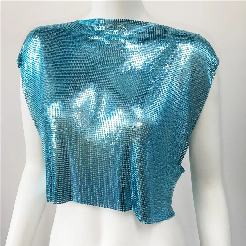 Sky Blue Y2k Shiny Metallic Sequins Festival T- Shirts Crop Tops Sexy Women Sleeveless See Through Glitter Sequin Club Party Rave T Shirt