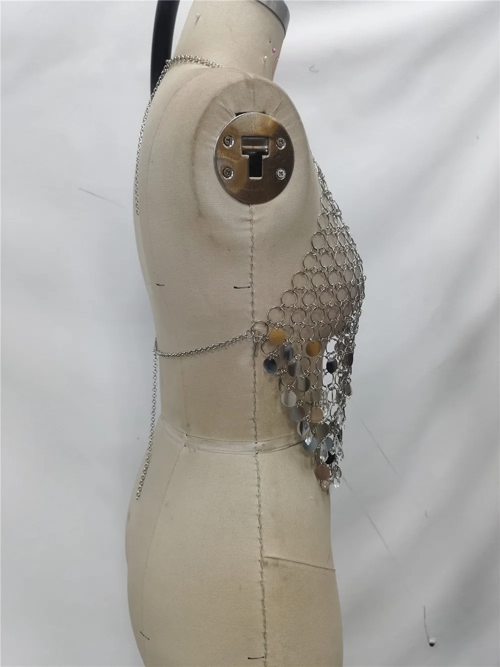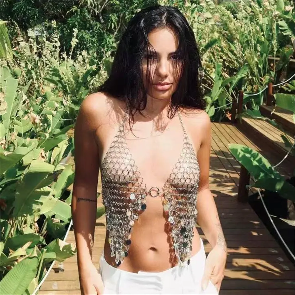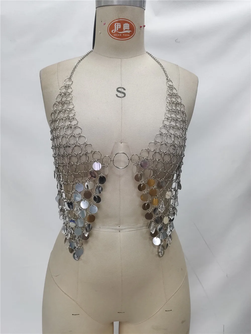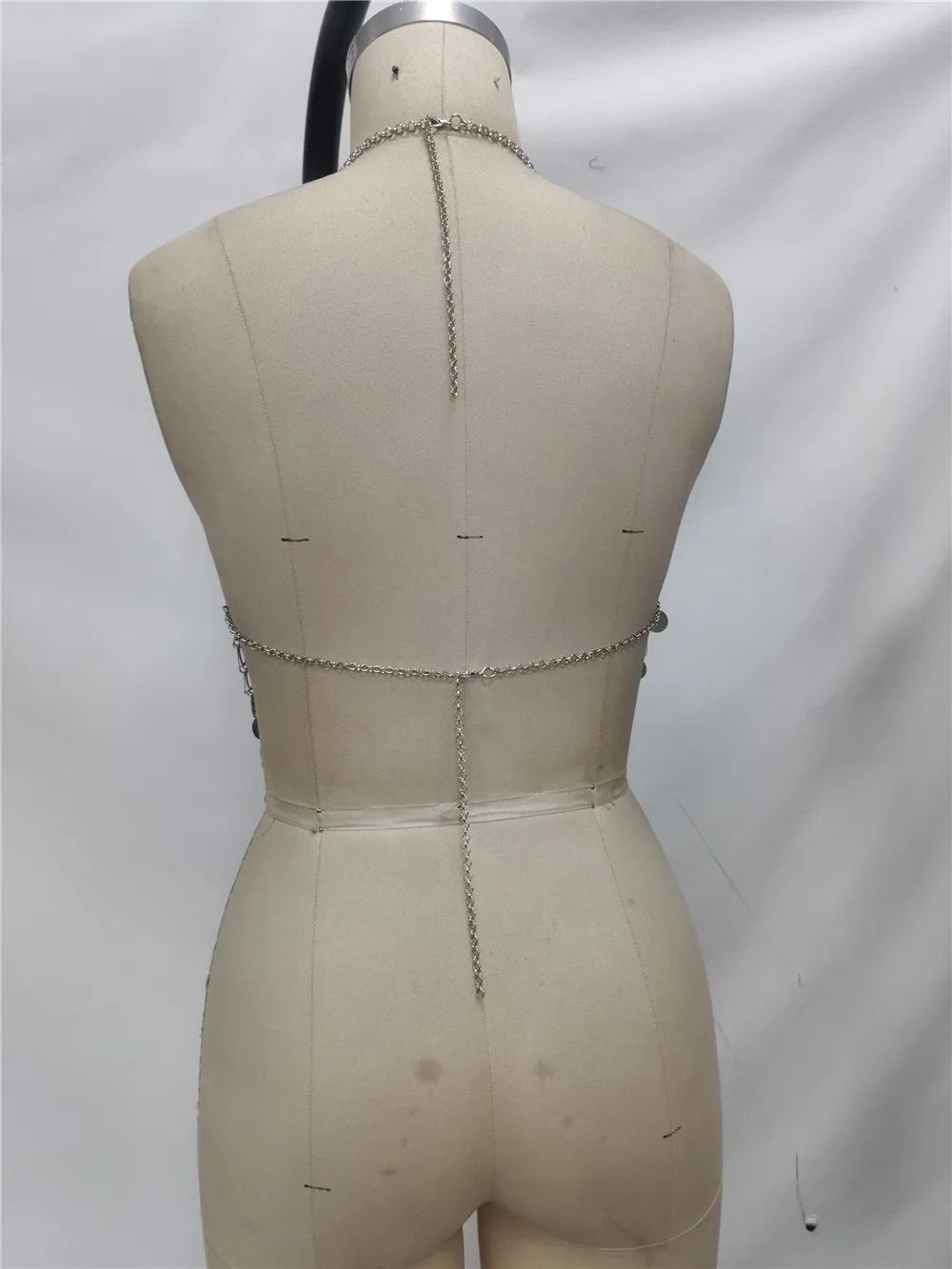 European & American Sexy Lace-Up Circle Sequined Tank Top For Women Designer Strapless Top Party Rhinestone Body Chain