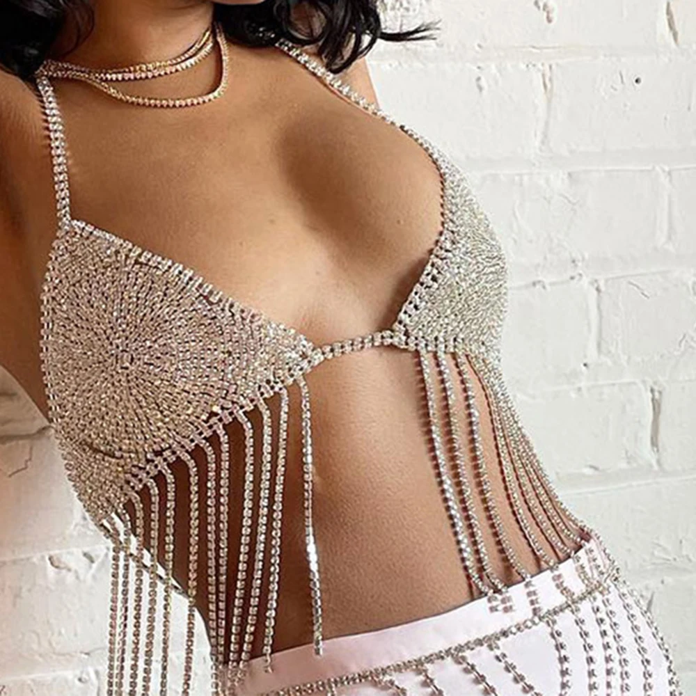 y2k Festival Luxury Rhinestone Bikini Top Women 2023 Sexy Night Club Party Backless Halter Fashion Diamond Tassel Crop Tops
